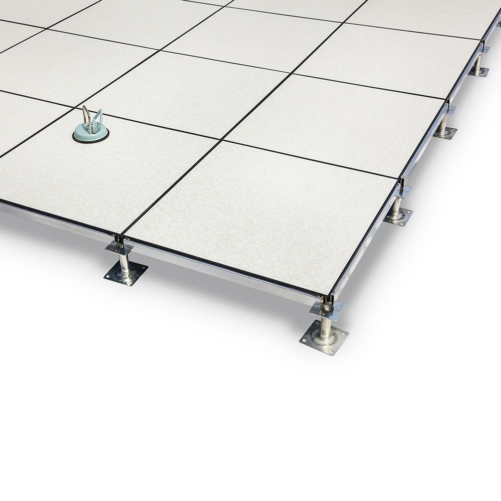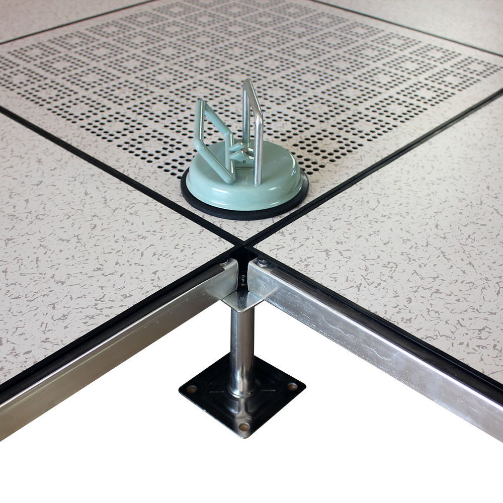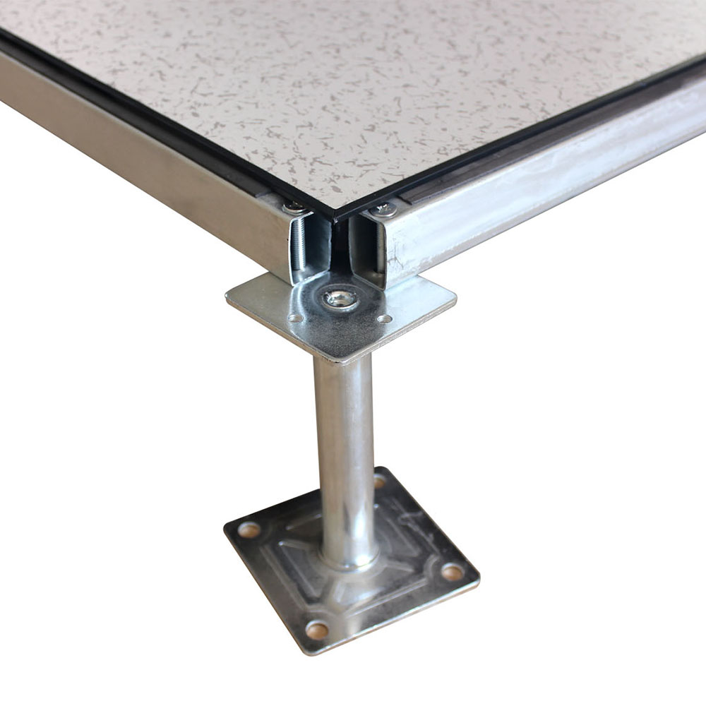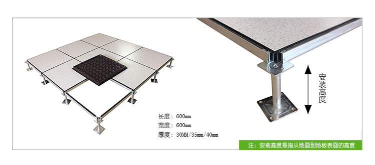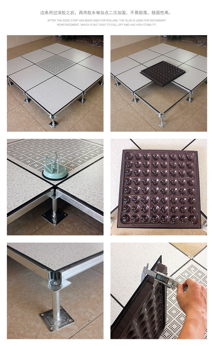 全钢防静电地板为全钢组件,分有边、无边、微边(三种边处理方式)。底面采用SPCC深冲冷轧板拉伸成型钢板厚度(0.4~1.5mm),球窝状结构,增加地板的机械荷载强度。面板采用硬质SPCC钢板(0.5~2.0mm),上下经过点焊焊接成型,切边冲孔后,经防锈处理,环氧树脂粉末静电喷涂后,中间填充发泡水泥(可以根据客户需求发泡不同重量),再经过日晒养护后形成稳定的承载结构。地板上表层粘贴防火板(HPL)/复合PVC/ 通体PVC/陶瓷地砖等不同材质的装饰表层,达到产品花色的多样性、可以根据客户需求个性化定制产品。搭配联网支架、支架、螺钉组装后,定位联接更加准确、精度可靠。