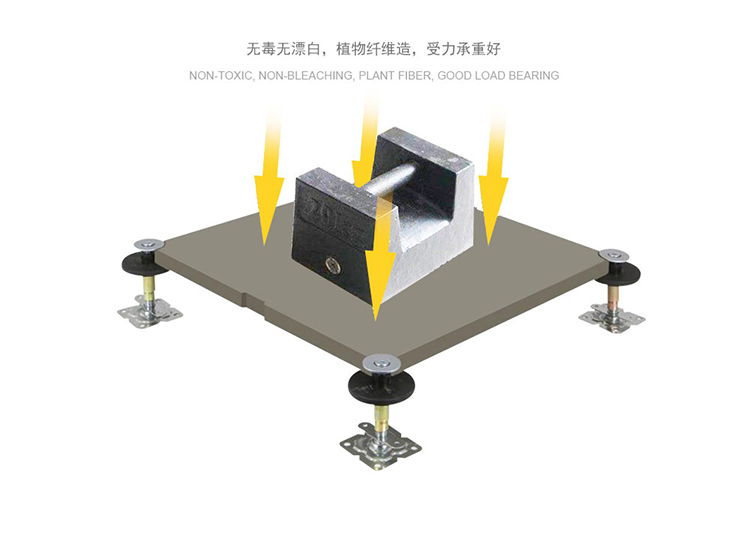无机质网络地板是由硅酸盐、无机纤维、矿物纤维、石英砂等材料经过高压一次成型的环保地板,每块地板自带穿线孔。地板四角镀锌底座支撑,不带横梁系统。每块地板四角有90度圆弧,四块板组合而成后形成一个圆,有一个铁制螺母压角固定。