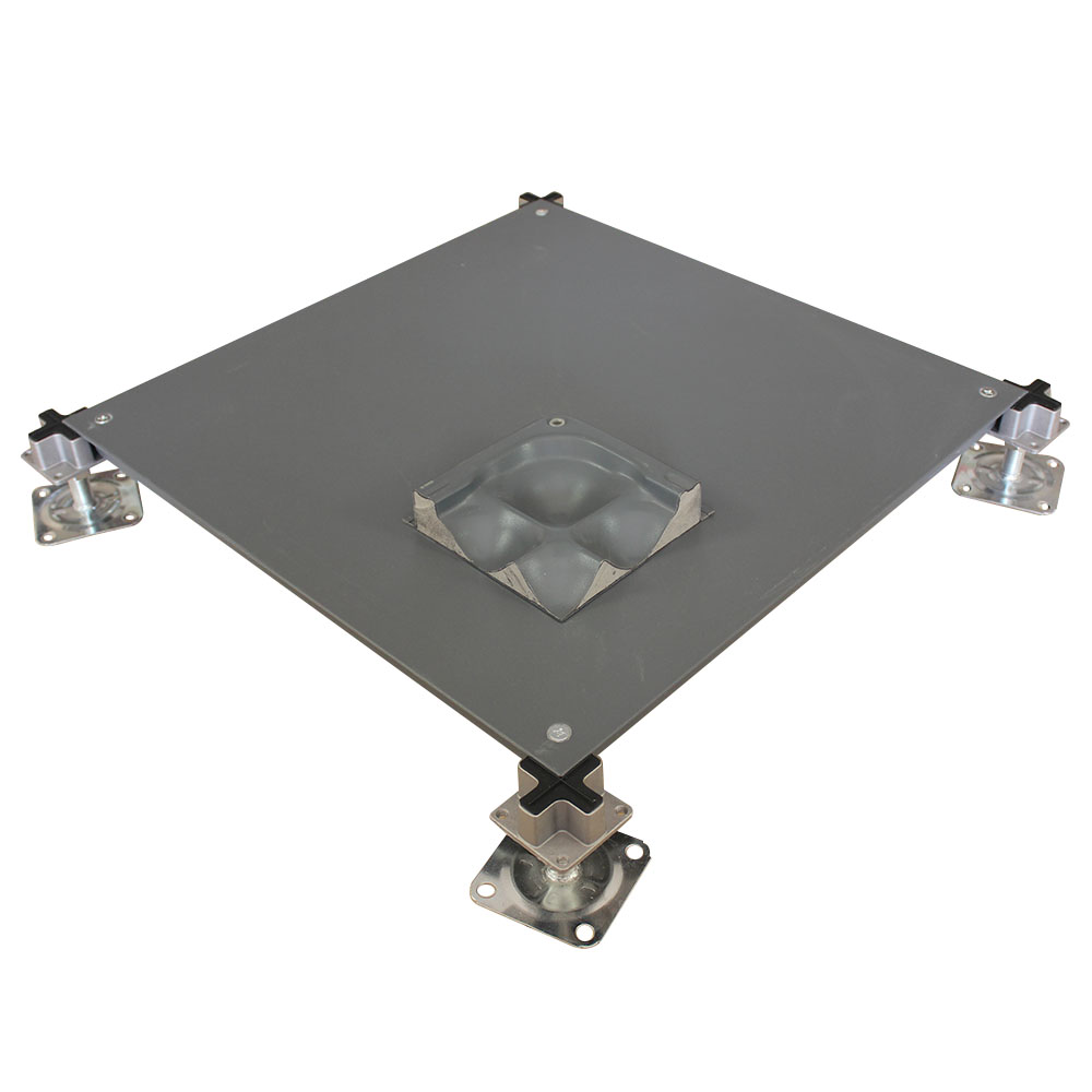 OA500网络架空地板采用钢板经拉伸成型、点焊、外表经防锈处理后进行静电粉末喷涂处理,内腔填充发泡水泥,四角带有角锁孔。支架为冷轧带钢钢板及铸铝合金铝头组成,可调节升降高度。由于智能化楼宇配线复杂,功能齐全,故出线口较多。