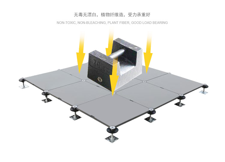 GRC水泥地板是由硅酸盐、无机纤维、矿物纤维、石英砂等材料经过高压一次成型的环保地板,每块地板自带穿线孔。地板四角镀锌底座支承,不带横梁系统。每块地板四角有90度圆弧,四块板组合而成后形成一个圆,有一个铁制螺母压角固定。铝头上配有圆形缓冲定位橡胶垫,防止地板受力后颤动引起的响声。支架高度可调5cm。